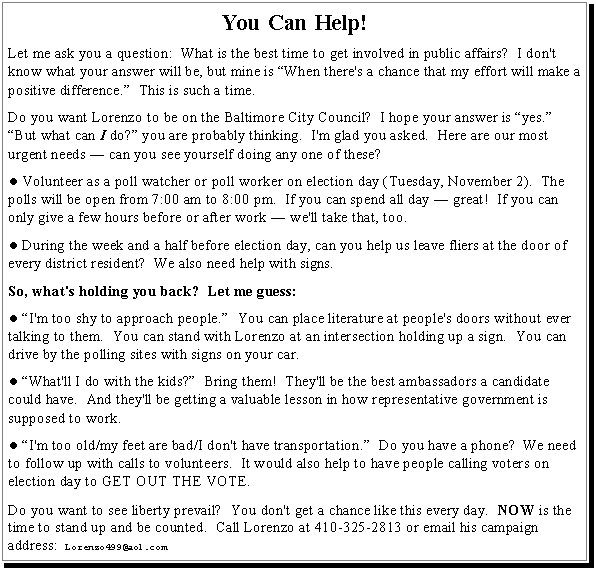 We started going door-to-door, introducing Lorenzo to his would-be constituents. Lorenzo appeared at three candidate forums: one in June hosted by the NAACP, one well publicized forum sponsored by the Project 1999 coalition (League of Women Voters, NAACP/Baltimore, Interdenominational Ministerial Alliance, and major Baltimore area colleges and universities), and one sponsored by Harbel, a northeast Baltimore community association.