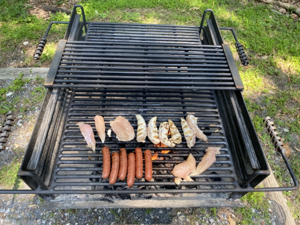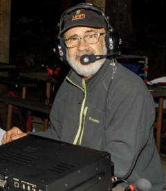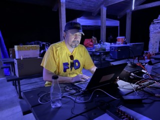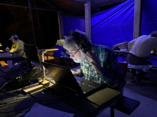 The first time the 80m vee went up it had to come right back down because the coax pulled out of its SO-239; Robert and Mike spliced another coax section on (lucky it's so low frequency) before putting it back up into the trees. Logan kept the grill going! Overnight